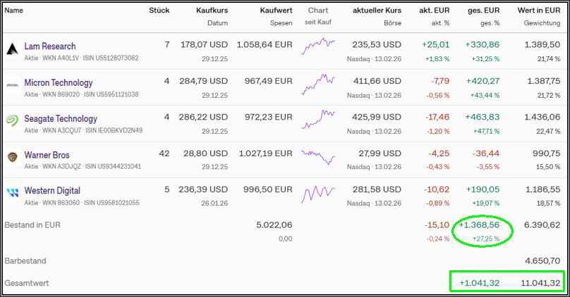 Die Rendite des aktuellen Depotbestands liegt bei +1368,56€ (+1.305,66€) oder +27,25% (+26,00%.