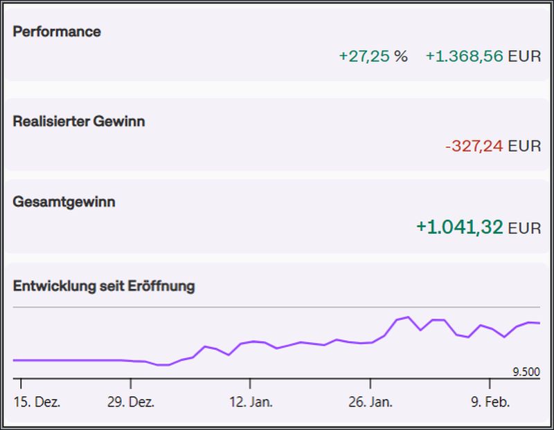 Aktuell liegt das Depot mit 1041,32€ (978,42€) im Plus. ![]()