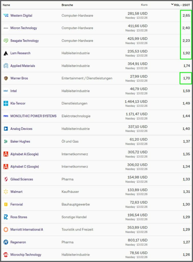 Hier die Nasdaq TOP 20 Liste der stärksten RSL Werte KW07