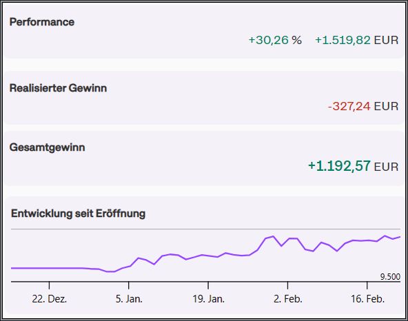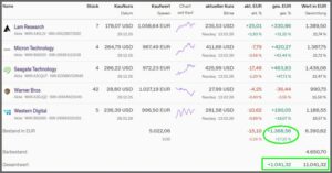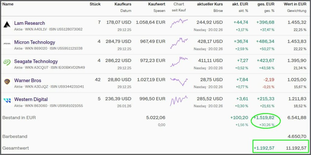 Aktuell liegt das Depot mit 1192,57€ (1041,32€ ) im Plus. ![]()