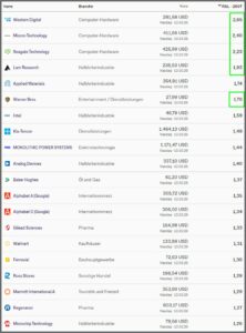 Die aktuellen Depotbestände sind grün markiert. Da alle Werte innerhalb der Top 20 liegen, ist kein Kauf / Verkauf erforderlich.
