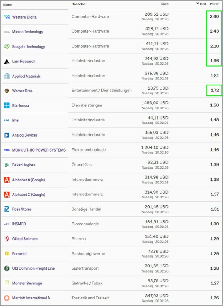 Hier die Nasdaq TOP 20 Liste der stärksten RSL Werte