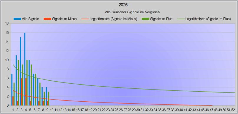 Hier wird eine kleine Statistik darüber gezeigt, wie viele Signale in den vergangenen 4 Wochen insgesamt generiert wurden und wie viele davon wöchentlich im Plus oder Minus liegen. Bisher dominieren die Signale, die im Plus liegen eindeutig.