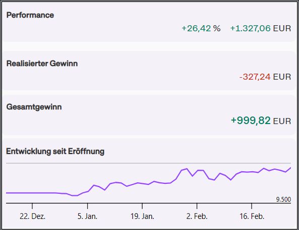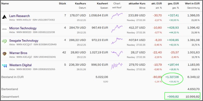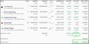 Aktuell liegt das Depot mit 999,82€ (1192,57€) im Plus.