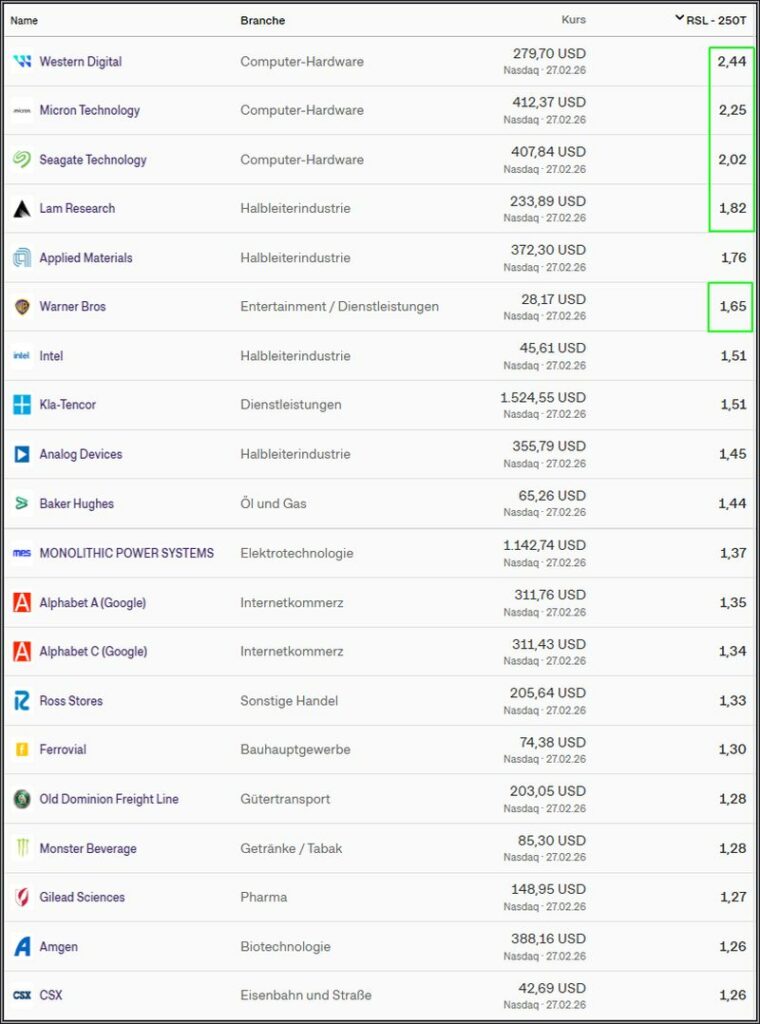 Hier die Nasdaq TOP 20 Liste der stärksten RSL Wert