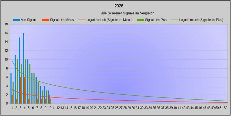 Hier wird eine kleine Statistik darüber gezeigt, wie viele Signale in den vergangenen 4 Wochen insgesamt generiert wurden und wie viele davon wöchentlich im Plus oder Minus liegen. Bisher dominieren die Signale, die im Plus liegen eindeutig.