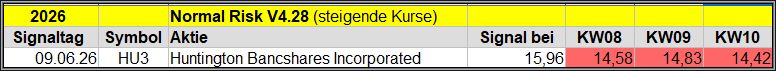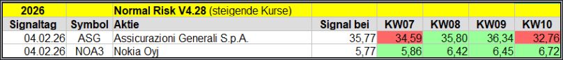 Den Kursverlauf der einzelnen Werte verfolge ich ab einem generierten Signal, über einen Zeitraum von 4 Wochen und mit einem wöchentlichen Update. (Kursiv geschriebene Texte sind in der Regel Texte aus der Vergangenheit bzw. sind Hinweise.)