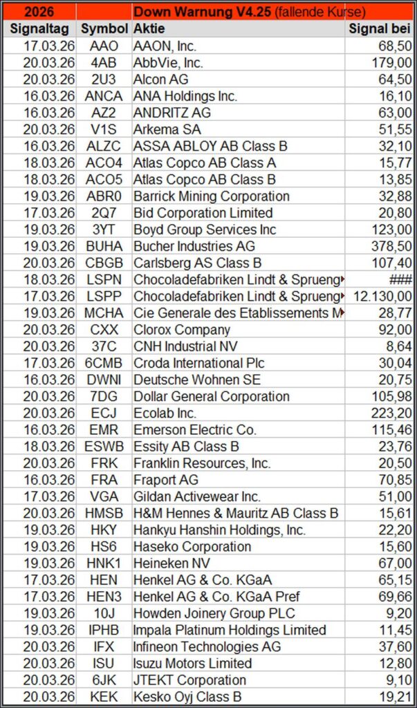 Dieser Screener setzt auf steigende Kurse und könnte auf einen neuen Trend nach oben hindeuten. Die Anzahl der Signale lässt auch einen Rückschluss auf den Gesamtmarkt zu, der möglicherweise bullischer wird, wenn viele „UP“ Signale generiert werden. Der Algorithmus wurde für 2026 überarbeitet , um der zunehmenden Volatilität zu begegnen.