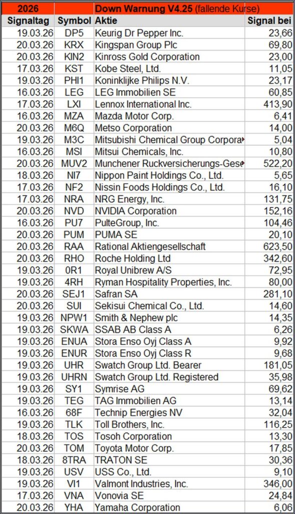 Bei den Signalen handelt es sich nur um eine ungeprüfte, automatisierte Vorauswahl, die man selbst prüfen muss und auf ausschließlich eigenes Risiko, nutzen könnte. Es handelt sich in keinem Fall um eine Aufforderung zum Kauf.