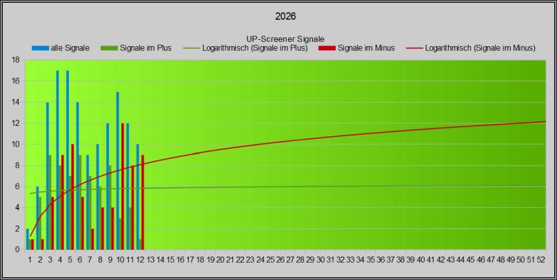 Die Gesamtsignale beziehen sich auf die vergangenen 4 Wochen und teilen sich in Signale, die sich in der jeweiligen Kalenderwoche im Plus bzw. im Minus befinden.
