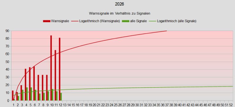 Hier werden die wöchentlichen Warnsignale mit Trendlinie und die Gesamtsignale angezeigt. Warnsignale, die über die logarithmische Trendlinie reichen, bedeuten ein möglicherweise eher schwieriges Umfeld.