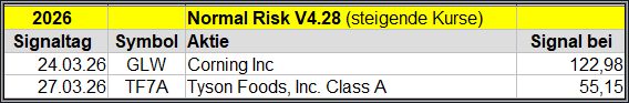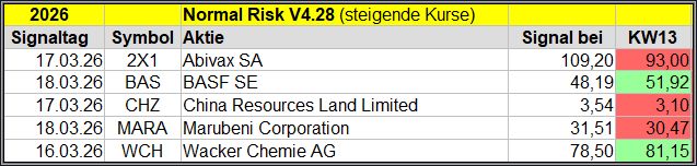 Den Kursverlauf der einzelnen Werte verfolge ich ab einem generierten Signal, über einen Zeitraum von 4 Wochen und mit einem wöchentlichen Update. (Kursiv geschriebene Texte sind in der Regel Texte aus der Vergangenheit bzw. sind Hinweise.)
