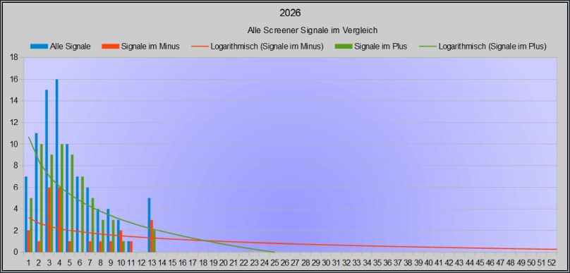 Hier wird eine kleine Statistik darüber gezeigt, wie viele Signale in den vergangenen 4 Wochen insgesamt generiert wurden und wie viele davon wöchentlich im Plus oder Minus liegen.
