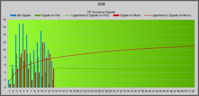 Dieser Screener setzt auf steigende Kurse und könnte auf einen neuen Trend nach oben hindeuten. Die Anzahl der Signale lässt auch einen Rückschluss auf den Gesamtmarkt zu, der möglicherweise bullischer wird, wenn viele „UP“ Signale generiert werden. Der Algorithmus wurde für 2026 überarbeitet , um der zunehmenden Volatilität zu begegnen.