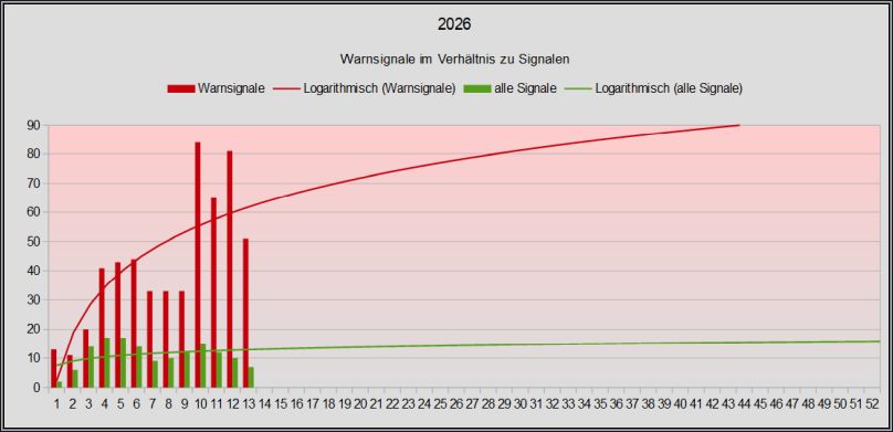 Die Gesamtsignale beziehen sich auf die vergangenen 4 Wochen und teilen sich in Signale, die sich in der jeweiligen Kalenderwoche im Plus bzw. im Minus befinden.