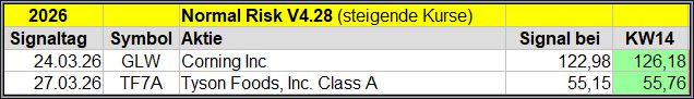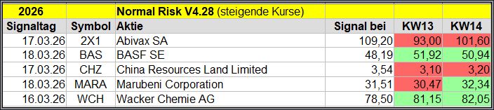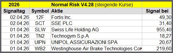 Den Kursverlauf der einzelnen Werte verfolge ich ab einem generierten Signal, über einen Zeitraum von 4 Wochen und mit einem wöchentlichen Update. (Kursiv geschriebene Texte sind in der Regel Texte aus der Vergangenheit bzw. sind Hinweise.)