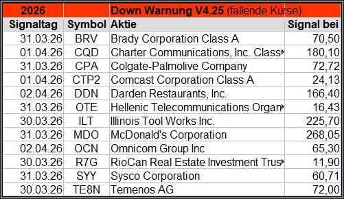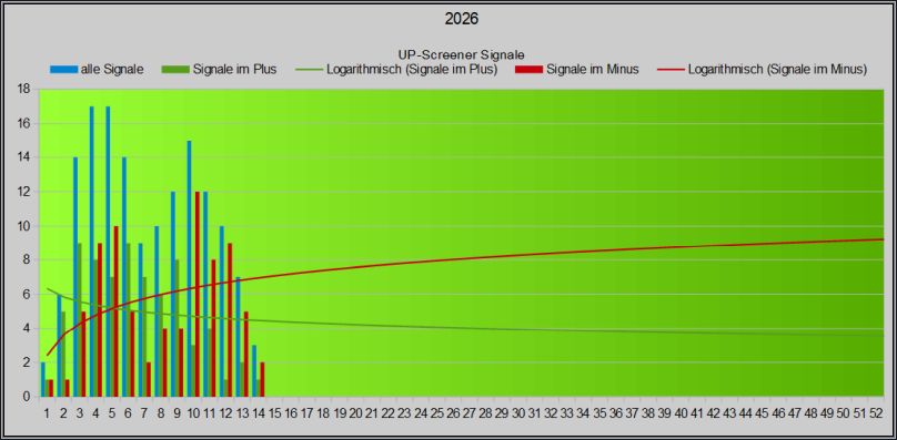 Dieser Screener setzt auf steigende Kurse und könnte auf einen neuen Trend nach oben hindeuten. Die Anzahl der Signale lässt auch einen Rückschluss auf den Gesamtmarkt zu, der möglicherweise bullischer wird, wenn viele „UP“ Signale generiert werden. Der Algorithmus wurde für 2026 überarbeitet , um der zunehmenden Volatilität zu begegnen.
