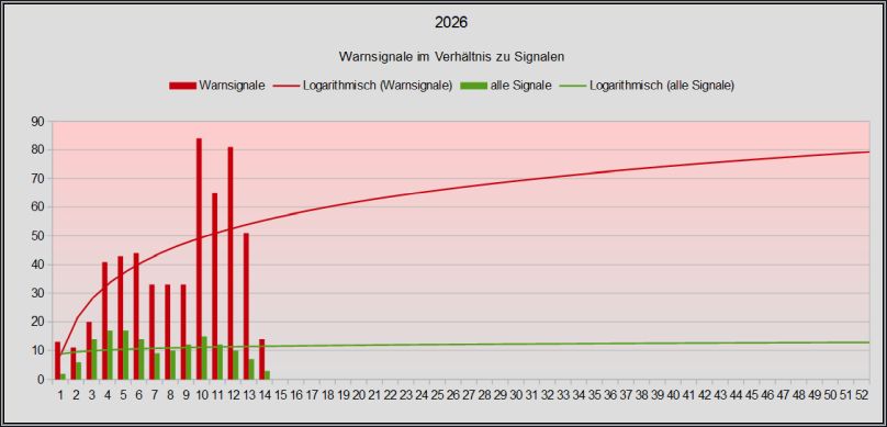Hier werden die wöchentlichen Warnsignale mit Trendlinie und die Gesamtsignale angezeigt. Warnsignale, die über die logarithmische Trendlinie reichen, bedeuten ein möglicherweise eher schwieriges Umfeld.