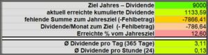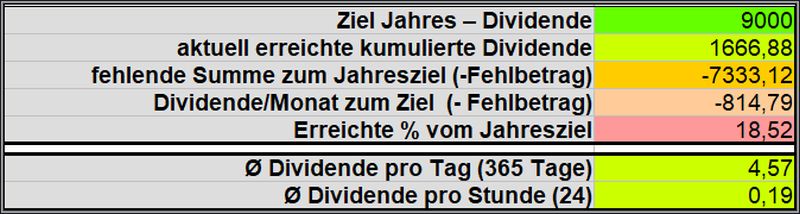 Vom Jahresziel 9.000€ wurden aktuell 18,52 % (12,6%) erreicht. Damit liegt das Ergebnis klar unter dem theoretischen Soll von 25,91%