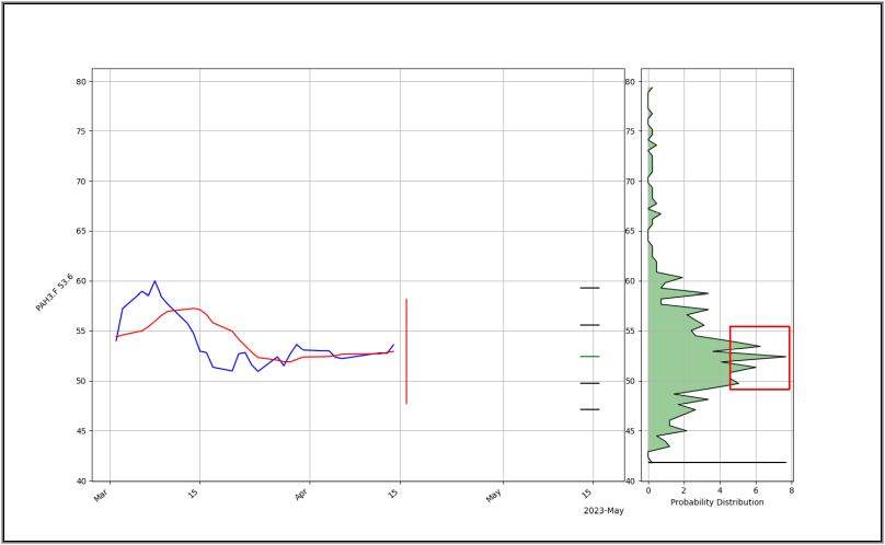 Auf Basis der letzten 1000 Kurse ergibt sich für den Wert aktuell die rechnerisch höchste Wahrscheinlichkeit im Bereich des eingezeichneten, roten Rechtecks.