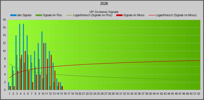 Dieser Screener setzt auf steigende Kurse und könnte auf einen neuen Trend nach oben hindeuten. Die Anzahl der Signale lässt auch einen Rückschluss auf den Gesamtmarkt zu, der möglicherweise bullischer wird, wenn viele „UP“ Signale generiert werden. Der Algorithmus wurde für 2026 überarbeitet , um der zunehmenden Volatilität zu begegnen.