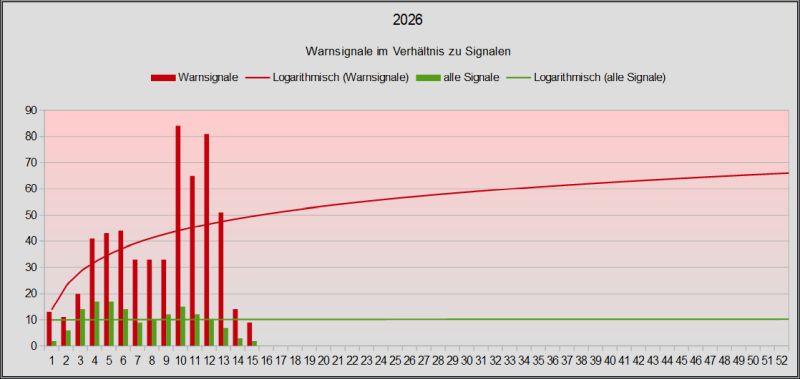 Hier werden die wöchentlichen Warnsignale mit Trendlinie und die Gesamtsignale angezeigt. Warnsignale, die über die logarithmische Trendlinie reichen, bedeuten ein möglicherweise eher schwieriges Umfeld.