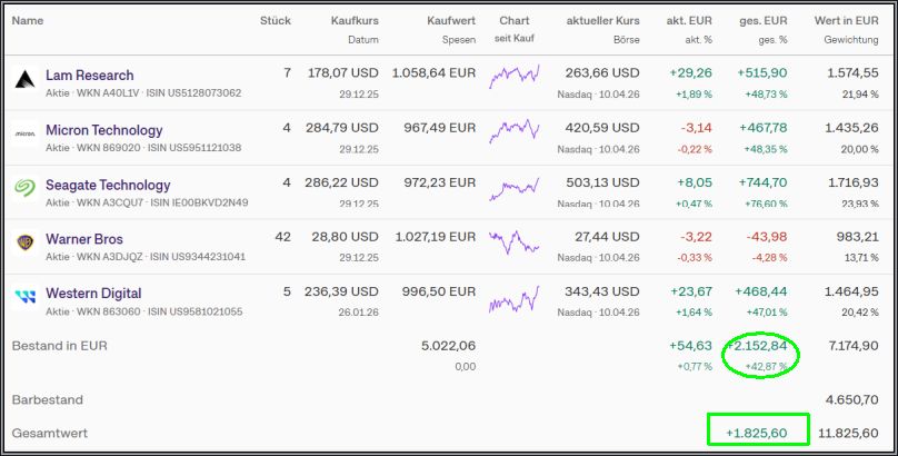 Aktuell liegt das Depot mit 1825,60€ (1011,35€) im Plus. ![]()