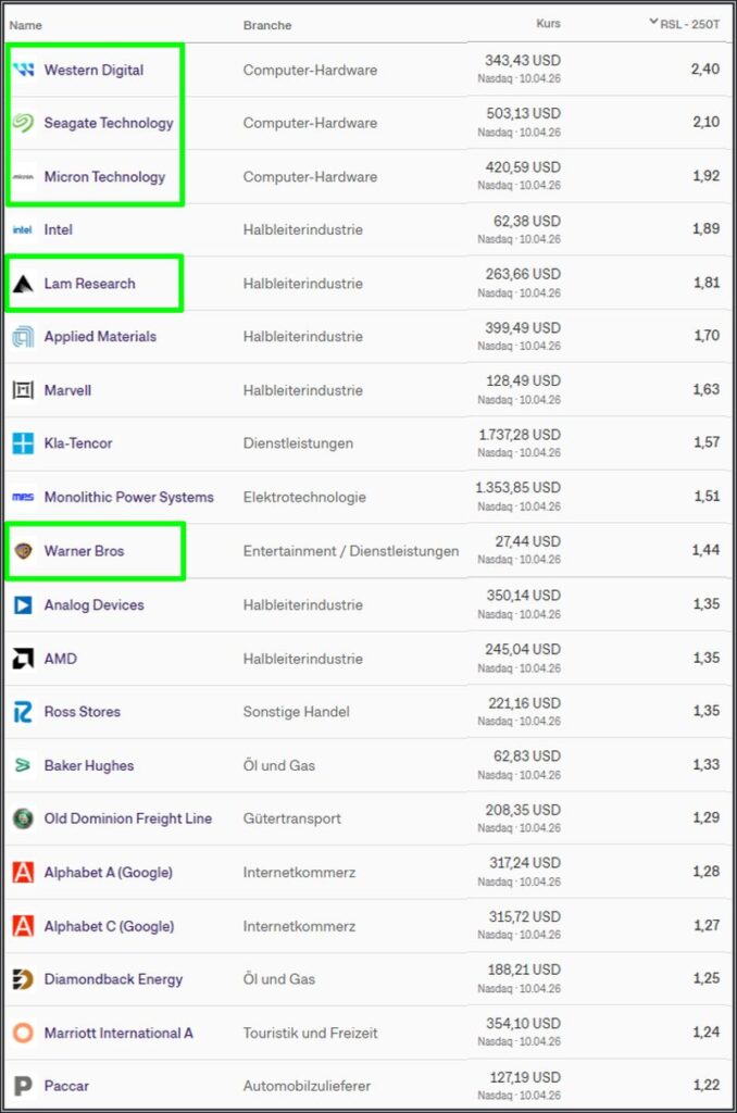 Hier die Nasdaq TOP 20 Liste der stärksten RSL Wert