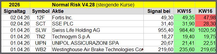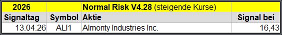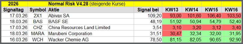 Den Kursverlauf der einzelnen Werte verfolge ich ab einem generierten Signal, über einen Zeitraum von 4 Wochen und mit einem wöchentlichen Update. (Kursiv geschriebene Texte sind in der Regel Texte aus der Vergangenheit bzw. sind Hinweise.)