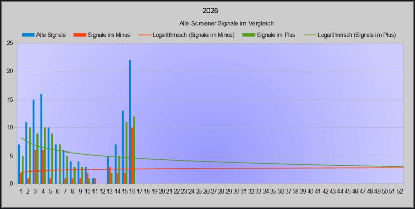 Hier wird eine kleine Statistik darüber gezeigt, wie viele Signale in den vergangenen 4 Wochen insgesamt generiert wurden und wie viele davon wöchentlich im Plus oder Minus liegen.