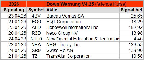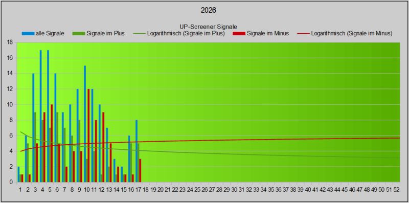 Dieser Screener setzt auf steigende Kurse und könnte auf einen neuen Trend nach oben hindeuten. Die Anzahl der Signale lässt auch einen Rückschluss auf den Gesamtmarkt zu, der möglicherweise bullischer wird, wenn viele „UP“ Signale generiert werden. Der Algorithmus wurde für 2026 überarbeitet , um der zunehmenden Volatilität zu begegnen.