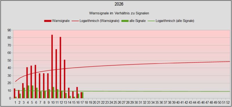 Hier werden die wöchentlichen Warnsignale mit Trendlinie und die Gesamtsignale angezeigt. Warnsignale, die über die logarithmische Trendlinie reichen, bedeuten ein möglicherweise eher schwieriges Umfeld.
