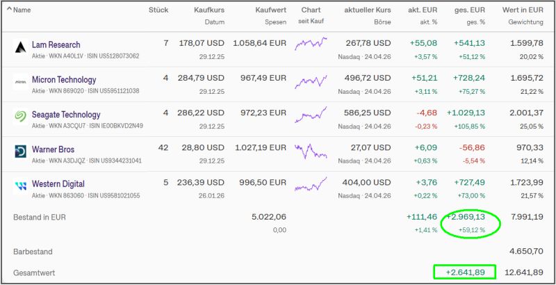 Aktuell liegt das Depot mit 2641,89€ (2218,39€) im Plus. ![]()