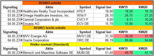 - Bei den Signalen mit leicht erhöhtem Risiko liegen nach der 2. Woche, MVV Energie noch leicht im Minus und Oracle schon deutlich im Plus.