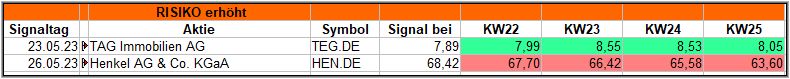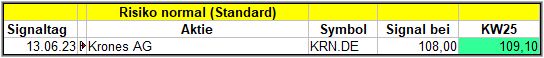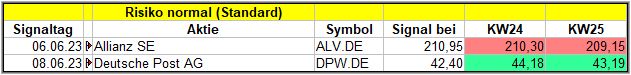 Nun kommen wir zum Update der vorigen Screener-Ergebnisse aus der KW21, KW22, KW23 und KW24, bezogen auf die Schlusskurse in KW25/23. KW20/23 fällt in dieser Woche weg.