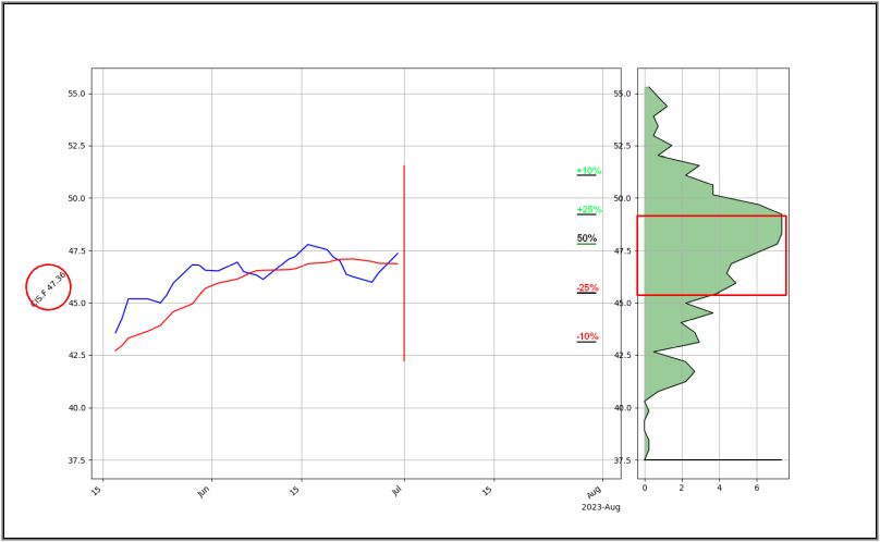 Auf Jahressicht (ohne Darstellung) zeigt die Spanne, zwischen den 25% Wahrscheinlichkeiten (rotes Rechteck), einen möglichen Kurs zwischen 42,18€ bis 56,25€ an.