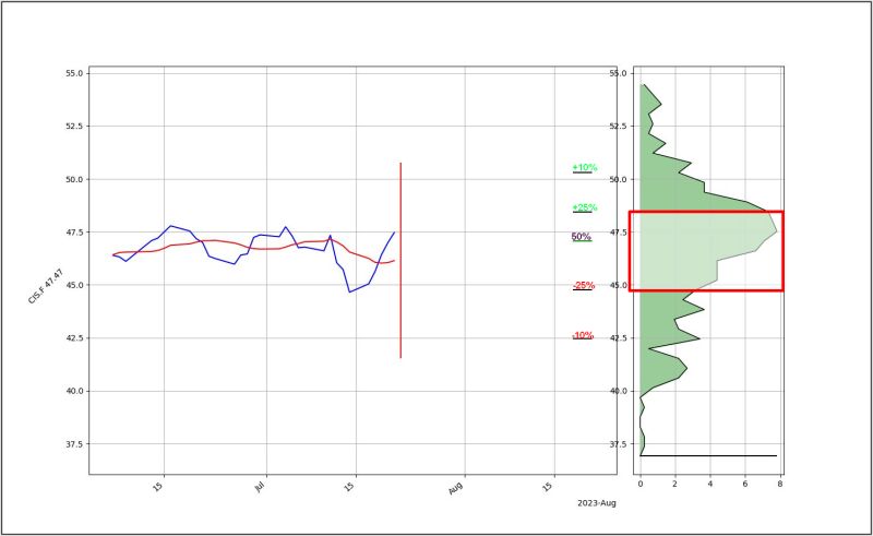 Auf Jahressicht (ohne Darstellung) zeigt die Spanne, zwischen den 25% Wahrscheinlichkeiten (rotes Rechteck), einen möglichen Kurs zwischen 41,99€ bis 55,37€ an.