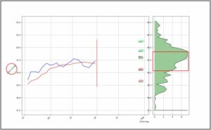 Das rote Rechteck markiert den relevantesten Bereich, der zwischen einer Wahrscheinlichkeit von 25% ins Plus und 25% ins Minus liegt. Die höchste Wahrscheinlichkeit für ein Kursziel liegt bei der höchsten Spitze innerhalb der Markierung