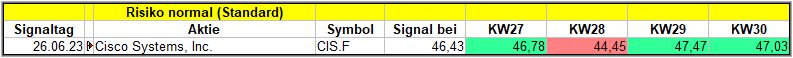 Ende der Woche liegt Cisco Systems weiter im Plus und konnte damit auch die 4. Woche im Plus abschließen, auch wenn der Kurs ein wenig nachgegeben hat.