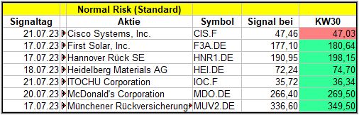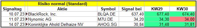 Nun kommen wir zum Update der vorigen Screener-Ergebnisse aus der KW26, KW27, KW28 und KW29, bezogen auf die Schlusskurse in KW30/23. KW25/23 fällt in dieser Woche weg.