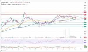 Der Kurs bewegt sich seit April in einer Spanne zwischen 261€ und 274€ seitwärts, wenn man von der größeren länger bestehenden Seitwärtsbewegung zwischen 239€ und 281€ absieht und befindet sich zusätzlich noch in einem Dreieck, das zuletzt nur an der oberen, fallenden Linie geprüft wurde.
