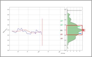 Das rote Rechteck markiert den relevantesten Bereich, der zwischen einer Wahrscheinlichkeit von 25% ins Plus und 25% ins Minus liegt. Die höchste Wahrscheinlichkeit für ein Kursziel liegt bei der höchsten Spitze innerhalb der Markierung