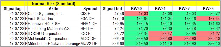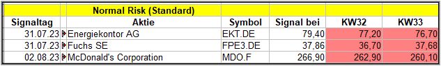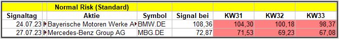 Nun kommen wir zum Update der vorigen Screener-Ergebnisse aus der KW29, KW30, KW31 und KW32, bezogen auf die Schlusskurse in KW33/23. KW28/23 fällt in dieser Woche weg.