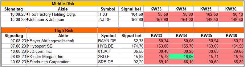 Nun kommen wir zum Update der vorigen Screener-Ergebnisse aus der KW32, KW33, KW34 und KW35, bezogen auf die Schlusskurse in KW36/23. KW31/23 fällt in dieser Woche weg.